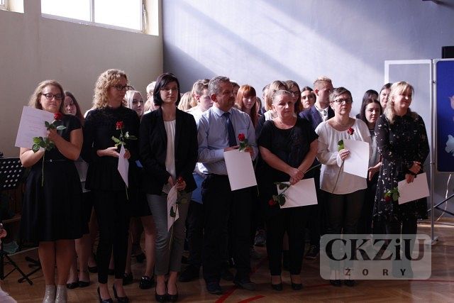 Szkoła może także poszczycić się nagrodą Prezydenta Miasta Żory przyznaną w tym roku szkolnym pani Justynie Pajor oraz zaszczytnym wyróżnieniem w postaci nagrody Śląskiego Kuratora Oświaty, które przypadło panu Damiani Lejcie. Ostatnim punktem akademii było pożegnanie odchodzącej na emeryturę pani Elżbiety Murańskiej, pracującej do niedawna w obsłudze szkoły. Nagrodzonym składamy gratulacje, a wszystkim nauczycielom życzymy wytrwałości i sukcesów w pracy z młodzieżą.