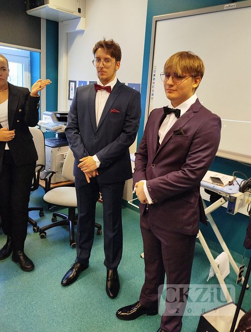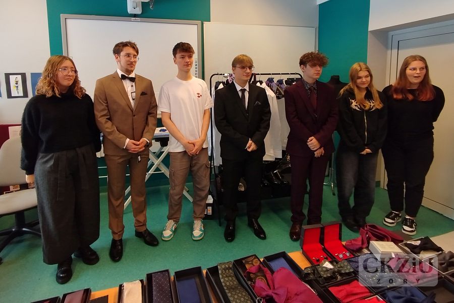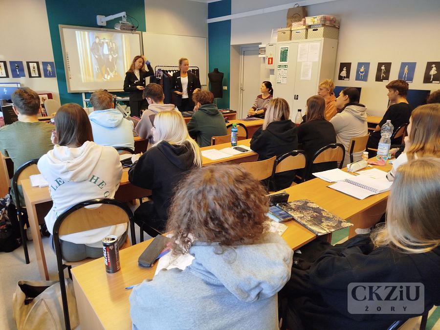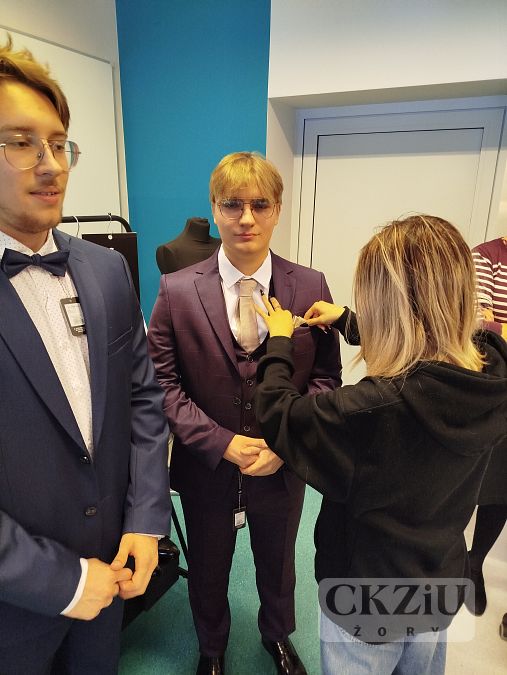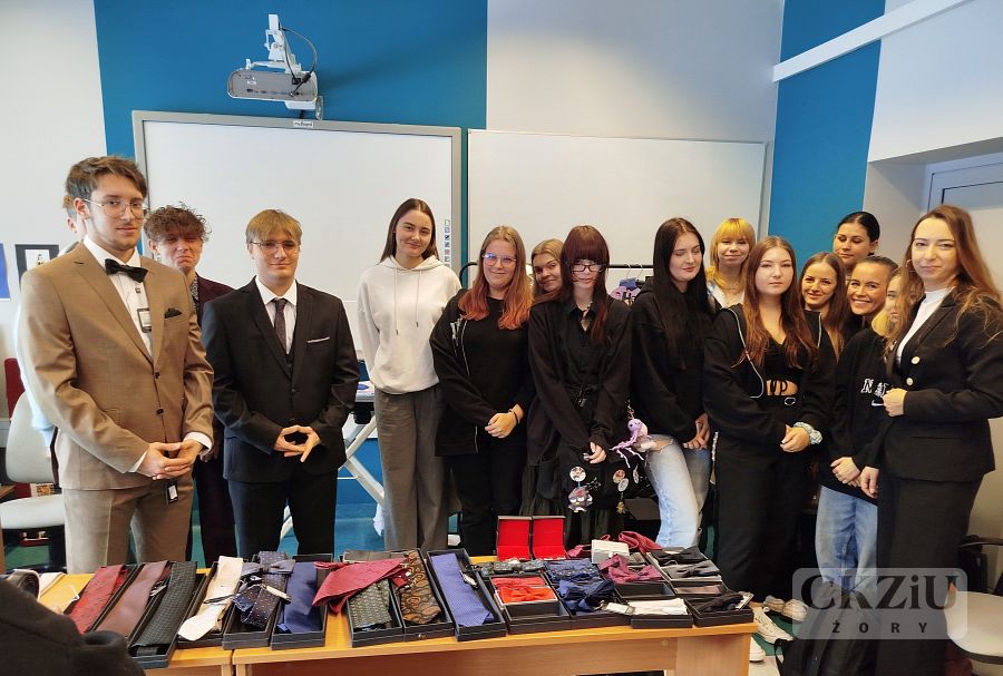 Wzięły w nich udział klasy 4cT, 4aT i 3dT. Głównym celem spotkania było szerzenie wiedzy wśród młodych ludzi na temat zasad eleganckiego wyglądu oraz przybliżenie kluczowych aspektów etykiety szykownego ubioru męskiego. Chętni uczniowie mieli okazję przymierzyć różne garnitury i próbowali dobrać dodatki i akcesoria, tworząc stylizacje na różne okoliczności, takie jak rozmowa o pracę, studniówka czy egzamin. Młodzi ludzie mogli poznać wiele ważnych zasad dress code i wyrazić swoje opinie na temat znaczenia ubioru i błędów, jakie można popełnić nosząc garnitur. Szczegółowo omówiono wszystkie stylizacje, uwzględniając cenne eksperckie wskazówki dotyczące długości rękawów marynarki, nogawek spodni, mankietów koszuli, brustaszy i butonierki, a także zalet noszenia kamizelek i prawidłowej długości krawata. Młodzież dowiedziała się, dlaczego warto dostosowywać stylizacje do danej sytuacji i jakie korzyści z tego wynikają. Ekspertki wizerunku zdradziły naszym uczniom kilka trików stylizacyjnych, takich jak odpowiednie zwężenie koszuli i właściwe dopasowanie kolorów/deseni do typu urody i sylwetki. Na koniec spotkania podczas części praktycznej uczniowie mieli okazję nauczyć się wiązania krawata i układania poszetki.