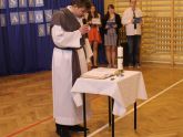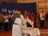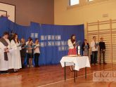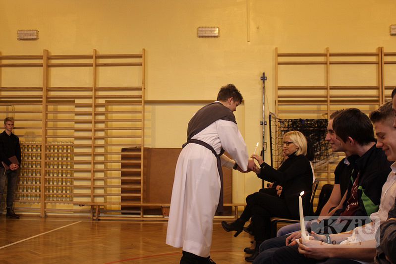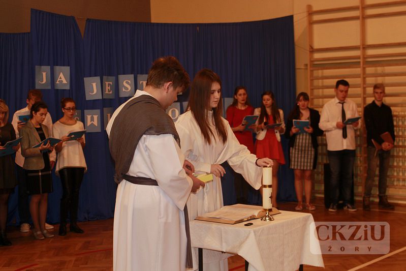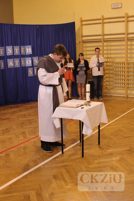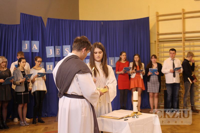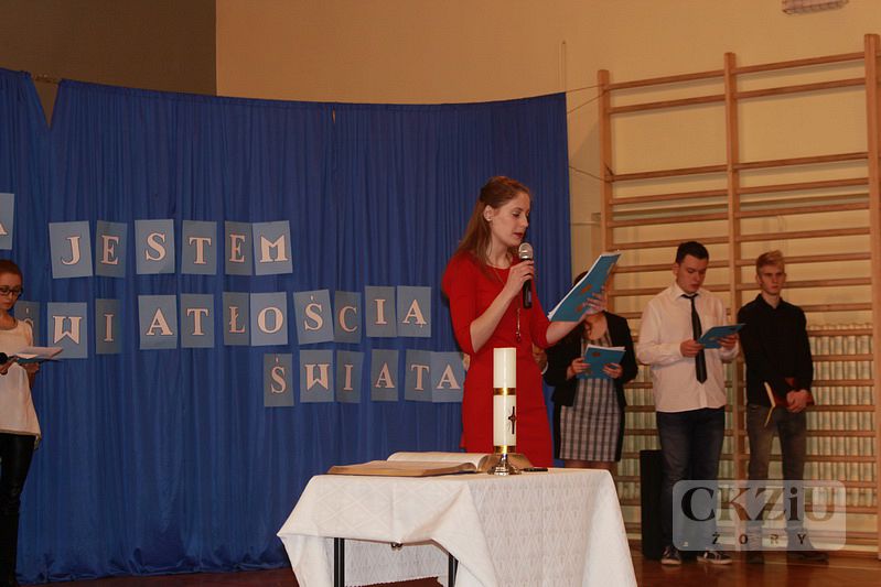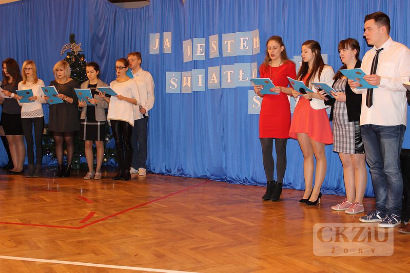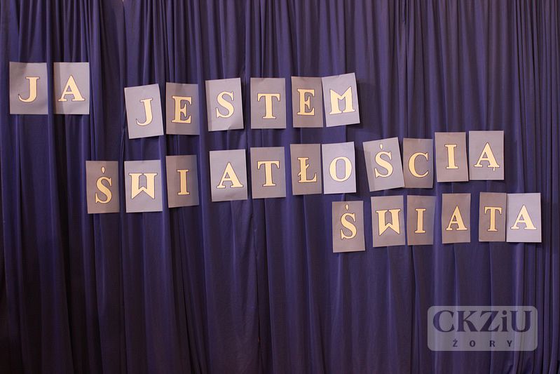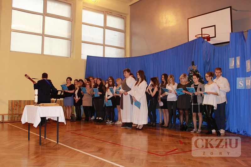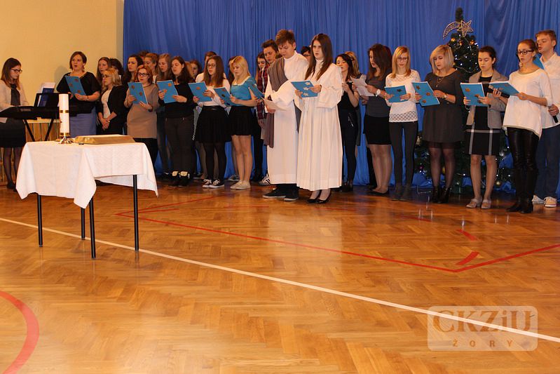 Teatralne spotkania przedświąteczne nazywane jasełkami są trwałym elementem kultury polskiej i chrześcijańskiej. Nasza szkolna społeczność znów przyczyniła się do rozwoju tej wielowiekowej tradycji przygotowując montaż słowno-muzyczny, nawiązujący do biblijnych wydarzeń związanych z przyjściem Syna Bożego na świat.Celem przedstawienia było przybliżenie uczniom i pracownikom naszego Centrum historii zbawienia, czyli cudownego wkroczenia w ludzkie dzieje Trójjedynego Boga. Centralne miejsce na scenie zajęła choinka, przypominająca nam o upadku człowieka przy drzewie rajskim oraz przede wszystkim odkupieńcze znaczenie drzewa krzyża Chrystusa. Na kotarze umieszczono napis „Ja Jestem światłością świata” – słowa Jezusa z Ewangelii wg św. Jana 8, 12. Uczniowie rozważali również inne fragmenty Słowa Bożego oraz czytali teksty opisujące świat i życie współczesnych, pokazując ich bolączki i problemy w blasku światła bijącego z betlejemskiego żłóbka. Podczas naszego spotkania nie zabrakło śpiewania kolęd i pastorałek. Pomógł w tym chórek złożony z uczniów naszej szkoły pod przewodnictwem pana Adama Rojka. Nie zabrakło także modlitwy o pokój, życzeń bożonarodzeniowych, które złożyła pani Dyrektor oraz krótkiego słowa ks. Mateusza Pietruszki. Montaż słowno-muzyczny zbudował świąteczną atmosferę i stanowił wspaniały wstęp do opłatkowych spotkań klasowych.