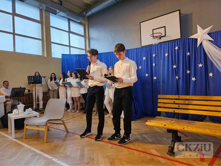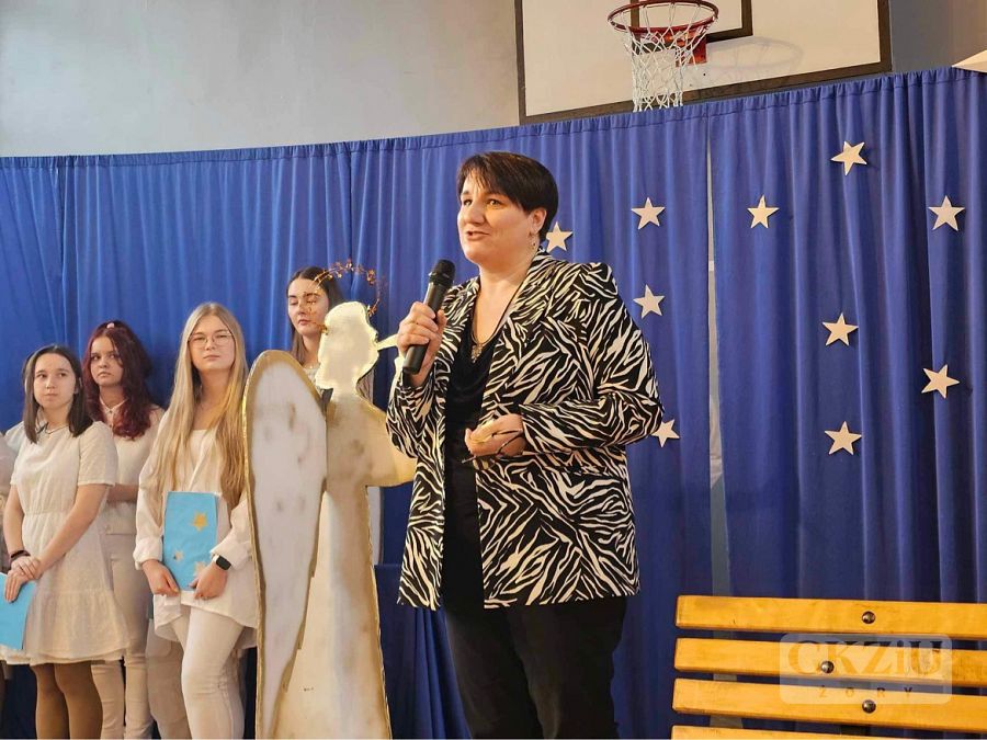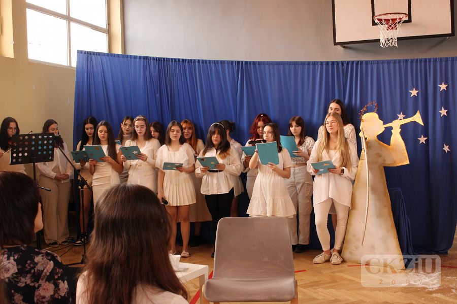 Piękne, poetyckie słowo dopełniło wspólne kolędowanie. Szkolny chór pod dyrekcją pana Adama Rojka wykonał nie tylko tradycyjne polskie kolędy, ale również kolędę w języku francuskim i hiszpańskim. Na zakończenie uroczystości pani wicedyrektor Dorota Timler złożyła zgromadzonym uczniom i nauczycielom życzenia radosnych, rodzinnych świąt, a przede wszystkim tego, by poczuć świąteczną magię w swoich sercach.