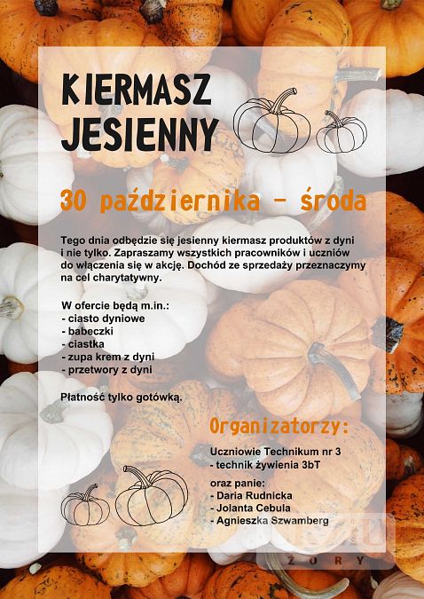 Już 30 października w środę w ramach szkolnego Dnia Dyni odbędzie się Jesienny Kiermasz Charytatywny. Zapraszamy wszystkich uczniów i nauczycieli do zakupu smacznych wyrobów uczniów klas gastronomicznych oraz pięknych jesiennych dekoracji wykonanych przez uczniów technikum przemysłu mody i stylistów. Całkowity dochód ze sprzedaży zostanie przekazany na cel charytatywny! Warto pomagać!