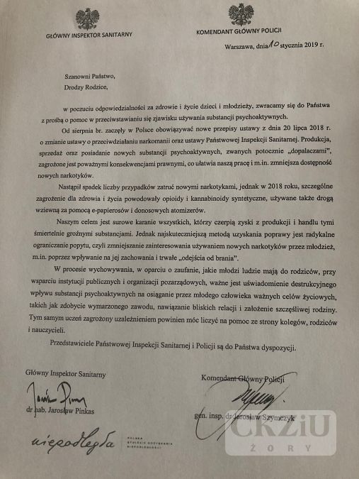 uprzejmie proszę o zapoznanie się ze skierowanym do Państwa listem Głównego Inspektora Sanitarnego i Komendanta Głównego Policji. Dotyczy on przeciwdziałania zażywaniu substancji potocznie nazywanych „dopalaczami”. (Treść listu znajduje się na dole strony).