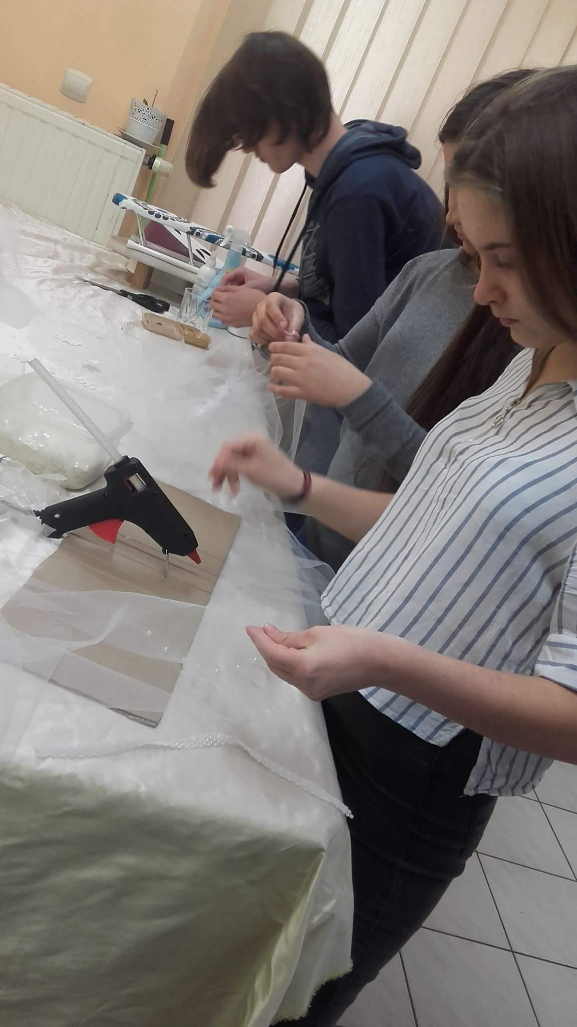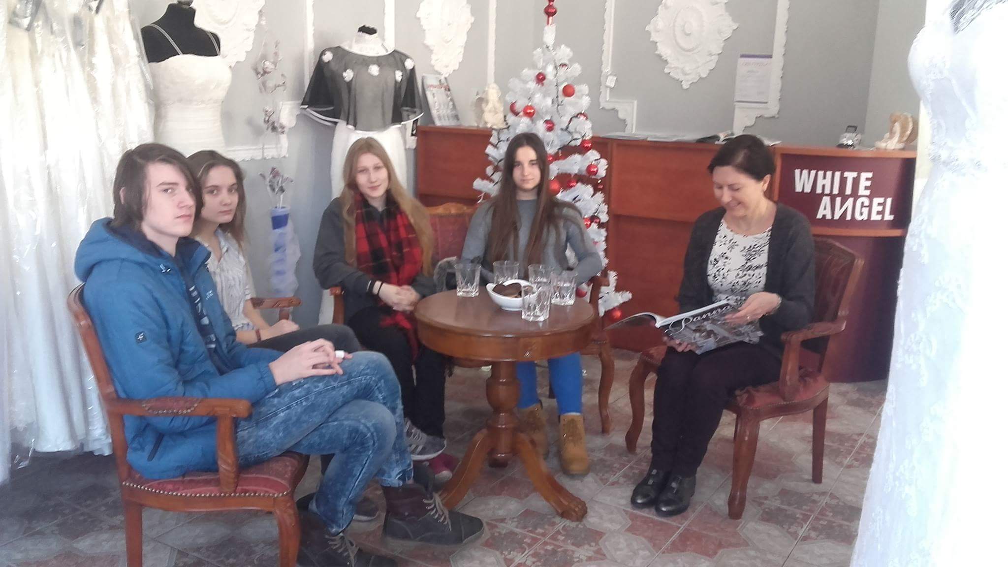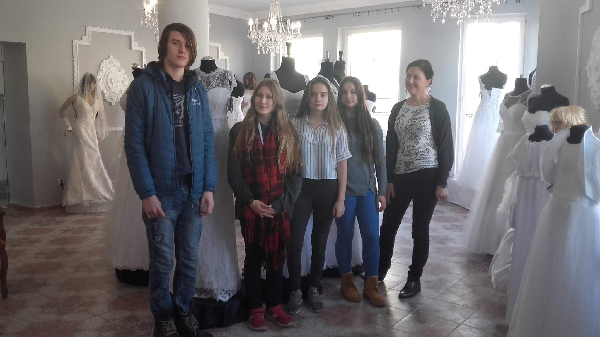 Następnym punktem programu była wizyta w salonie sukien ślubnych White Angel, w którym w niewielkiej szwalni powstają suknie marzeń. W salonie sukien ślubnych mogliśmy zapoznać się szczegółowo z przebiegiem miarowej produkcji ślubnych kreacji, które są wykonywane na indywidualne zamówienie klienta. Uczniowie uczestniczyli poza tym w zajęciach warsztatowych, ucząc się sposobu produkcji i dekorowania welonów.