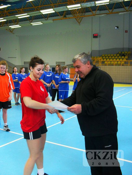 Dnia 6 lutego 2014r. na hali sportowej w Żorach rozegrano Mistrzostwa Żor w piłce ręcznej dziewcząt. Do turnieju zgłosiły się 4 szkoły: ZSO, ZS nr 2, III LO i CKZiU. Mecze rozgrywano systemem każdy z każdym. Nasza reprezentacja w pierwszym meczu z dużą łatwością pokonała I LO 6:0. W tym meczu wychodziło wszystko: świetna obrona, dobre rozegranie, wysoka dyspozycja bramkarki i przede wszystkim skutecznośc w ataku.W drugim meczu dziewczyny podjęły walkę, niestety przeciwniczki były zdecydowanie lepsze. Nasza drużyna przegrała z ekipą III LO. Decydujący okazał się więc ostatni mecz z drużyną ZS nr 2. Wygrana dawała naszej drużynie II miejsce. Dziewczyny były już zmęczone, ale wiedziały czego chcą i że to jest niesamowita okazja. Mecz był od samego początku wyrównany, gol za gol. Przez chwilę nasz zespół grał w osłabieniu, gdyż po dość mocnej obronie dostaliśmy 2 minuty kary. Na szczęście rewelacyjny mecz grała nasza bramkarka – Aneta Buchalik, która obroniła w całym turnieju 4 rzuty karne, w tym 2 właśnie w decydującym meczu. W ostatnich minutach przegrywałyśmy 2:3, na szczęście dziewczęta się nie poddawały i zdążyły rzucić wyrównującą bramkę. W ostatnich sekundach zabrakło troszkę szczęścia by wygrać, ponieważ rzut w ostatnich sekundach odbił się od słupka. Mecz zakończył się remisem. Naszą grę dobrze prowadziła i rozkręcała nasza kapitan Anna Grochowska.Ostatecznie po przeliczeniu punktów i bramek nasze dziewczęta zajęły III miejsce. Serdecznie gratulujemy waleczności i wytrwałości do samego końca.