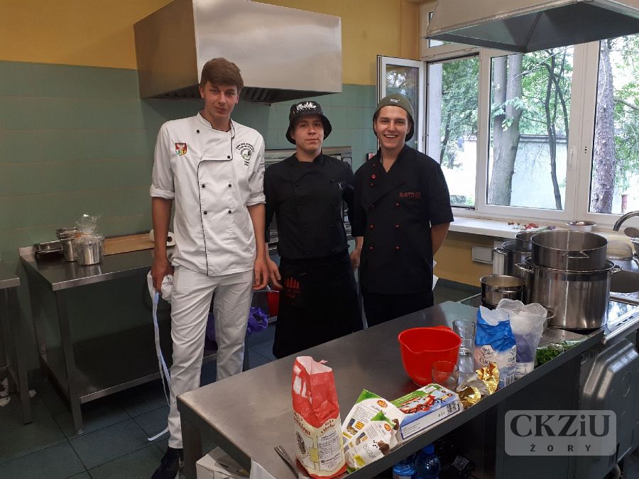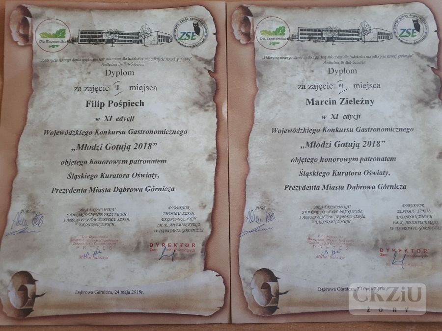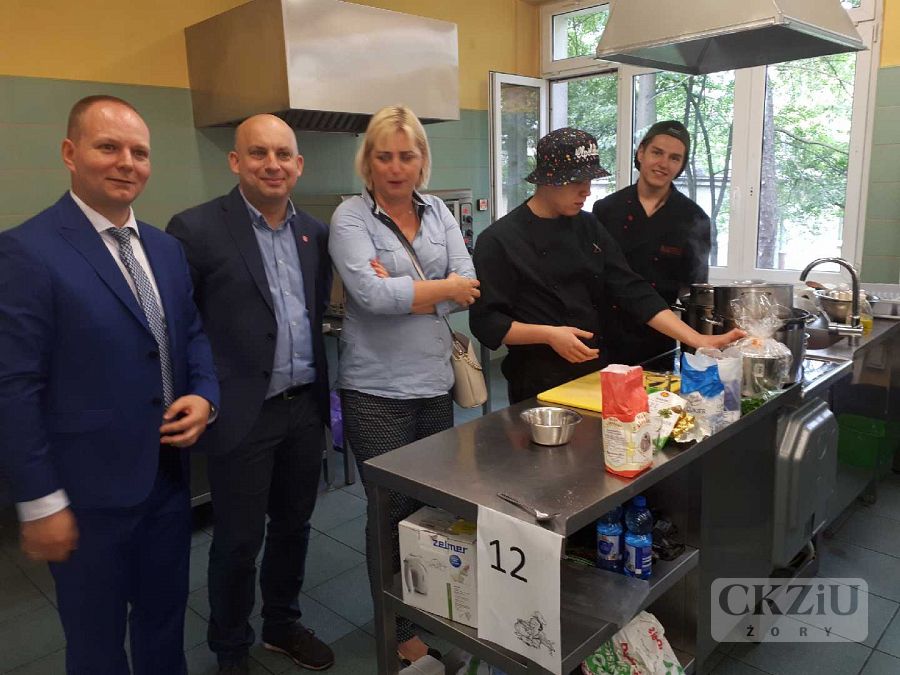 W dniu 24 maja 2018 r. uczniowie z klasy 2bZ Marcin Zieleźny i Filip Pośpiech reprezentowali naszą szkołę na XI konkursie wojewódzkim „Młodzi gotują” w Dąbrowie Górniczej. Tematem tegorocznej edycji był BUDYŃ. Konkurs składał się z dwóch części: I - to test dotyczący surowców do przygotowania budyniu czyli jaj. II – to zadanie praktyczne, na przygotowanie którego, uczestnicy mieli 120 minut. Suma punktów części I i II decydowała o zwycięstwie. Część praktyczna była oceniana przez profesjonalne jury składające się z szefów kuchni. Przewodniczącym jury konkursu był Top Szef Adrian Feliks. Poziom konkursu z roku na rok jest coraz wyższy co podkreślają szefowie i coraz trudniej wyłonić zwycięzców. Marcin i Filip wykorzystali swoje doświadczenie z poprzedniej edycji oraz swoje umiejętności zawodowe i dobre przygotowanie i dzięi temu zajęli III miejsce. Serdecznie im gratulujemy. Opiekę nad uczniami sprawował pan Adam Rojek.
