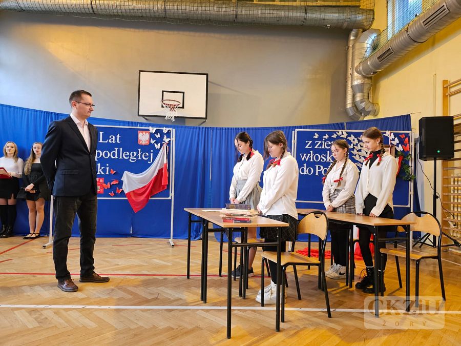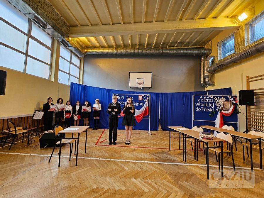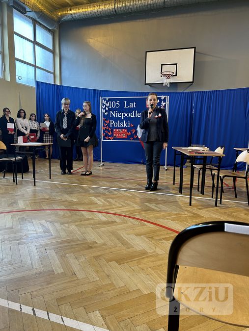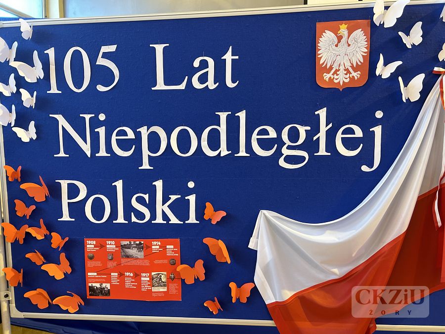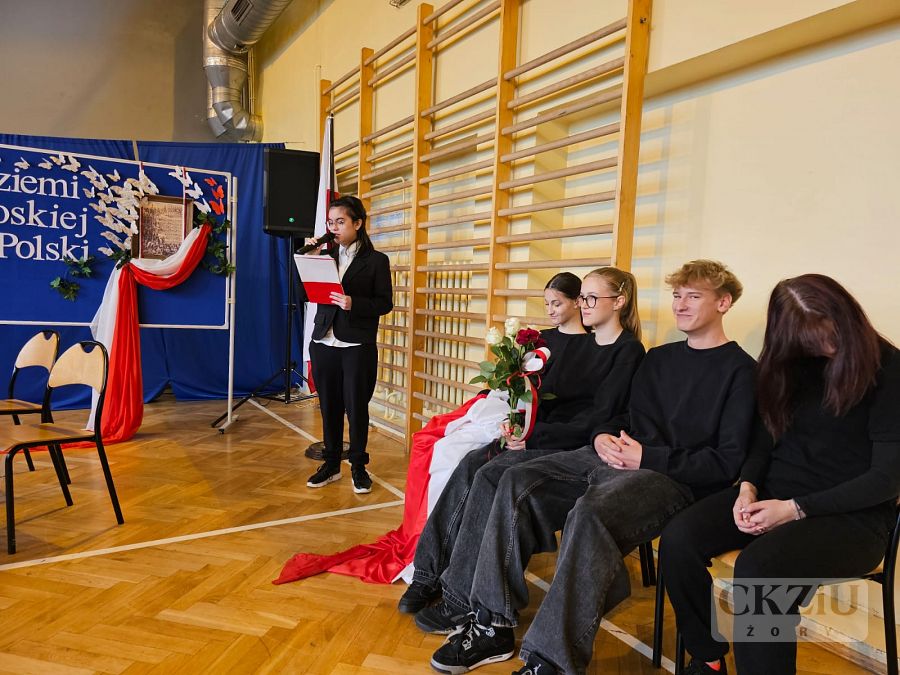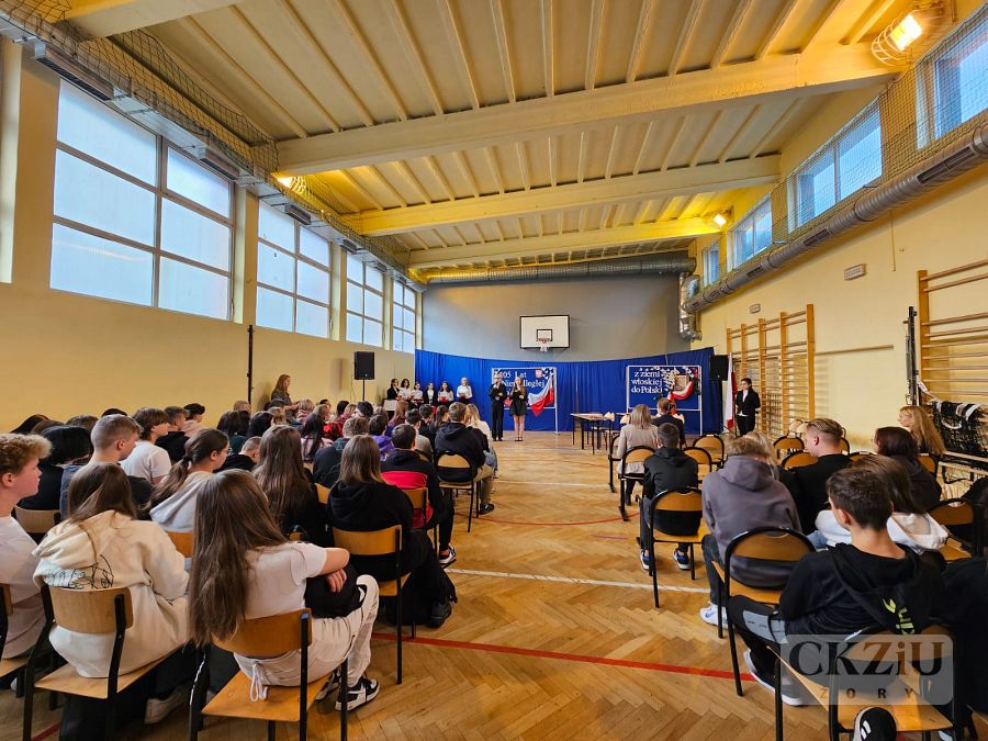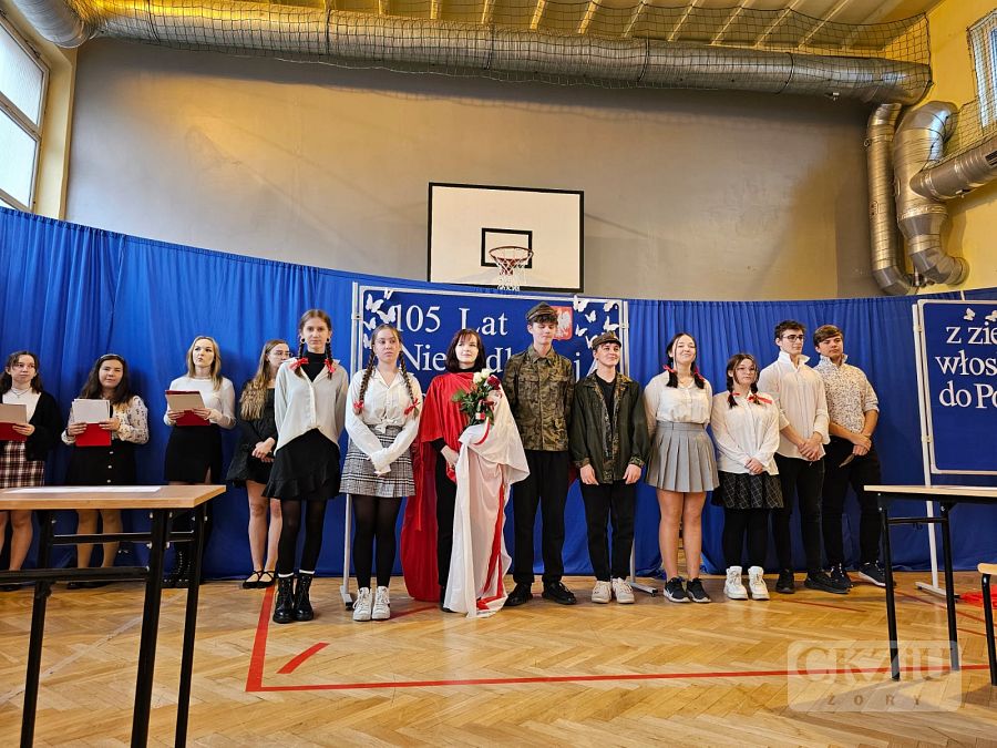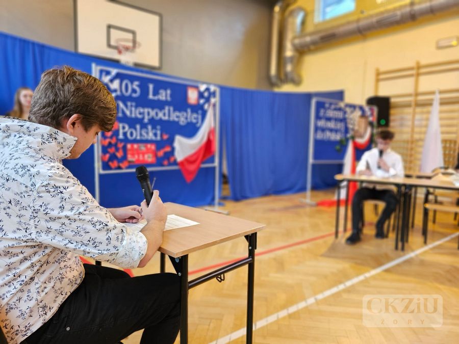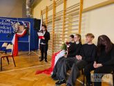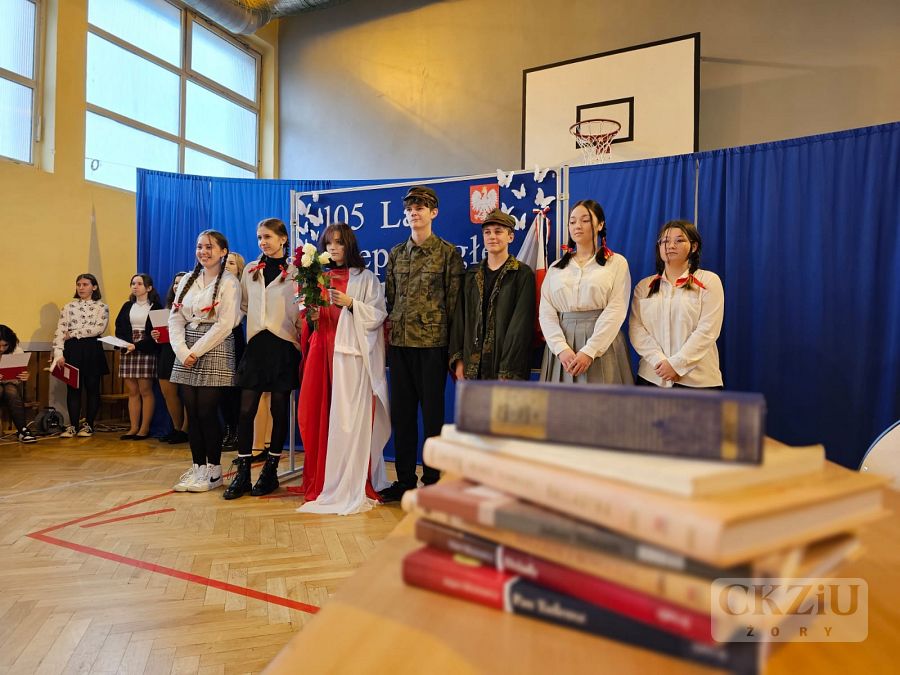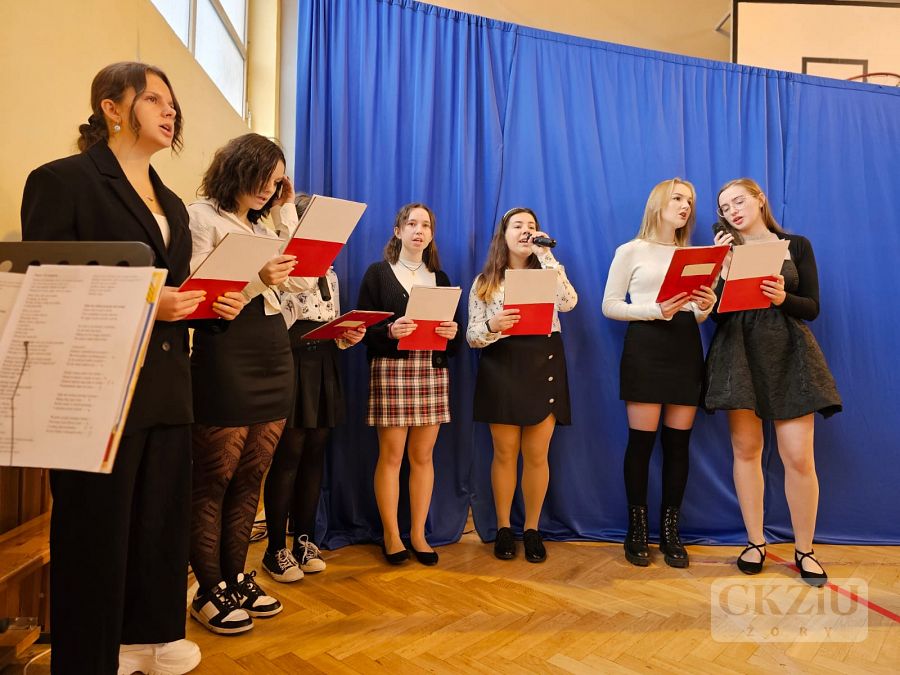 Patriotyczną atmosferę Narodowego Święta Niepodległości można było poczuć w naszej szkole już na kilka dni przez 11 listopada. Na korytarzach pojawiły się gazetki wykonane przez uczniów pod kierunkiem pani Małgorzaty Koj, które przypominały historię walk narodowo – wyzwoleńczych, jak również upamiętniały polski hymn narodowy – Mazurek Dąbrowskiego. 10 listopada wzięliśmy udział w akcji "Do Hymnu" i w klasach odśpiewaliśmy wspólnie hymn Polski, a 11 listopada 2023 r. młodzież z klasy 3aT pod opieką pana Błażeja Brożyny złożyła kwiaty pod żorskim pomnikiem walczących o niepodległość. Kolejnym punktem obchodów narodowego święta była, jak co roku, uroczysta akademia. Odbyła się ona 13 listopada 2023 r., a rozpoczęło ją odśpiewanie narodowego hymnu. Następnie uczniowie szkoły zaprosili nas w podróż po historii. W 105 rocznicę odzyskania niepodległości przypomniano najważniejsze wydarzenia związane z zaborami – utratę niepodległości, powstania narodowe, strajk szkolny we Wrześni oraz I wojnę światową i powstanie Legionów Józefa Piłsudskiego, których walka przyczyniła się do odzyskania niepodległości. Podkreślono także znaczenie polskiej literatury, która w okresie zaborów stała się orężem w walce o przetrwanie narodowej kultury, przypominając wybrane strofy wierszy Adama Mickiewicza i Juliusza Słowackiego. Nie zabrakło także wzruszającego, patriotycznego śpiewu w wykonaniu szkolnego chóru oraz refleksji na temat znaczenia wolności w dzisiejszych czasach: „Nie możemy zapominać, że historię tworzymy każdego dnia – tutaj i teraz. Wolność to nie tylko przywilej, lecz także obowiązek i wyzwanie dla naszego pokolenia oraz dla przyszłych pokoleń, które nadejdą po nas. Bo wolność to nie cel, lecz szansa. Bo wolność to wiara w ludzi”.