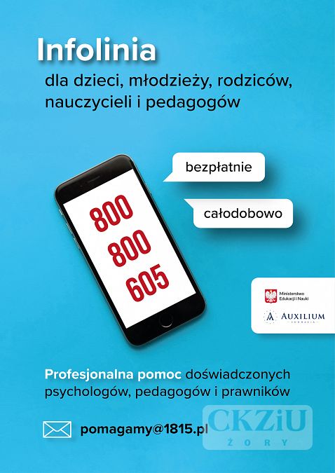 Informujemy, że od 6 września działa całodobowa, bezpłatna, ogólnopolska infolinia dla dzieci i młodzieży oraz ich opiekunów. Pod numerem telefonu 800 800 605 dzieci i młodzież, ale także rodzice, nauczyciele i pedagodzy mogą uzyskać profesjonalną pomoc doświadczonych psychologów, pedagogów i prawników.