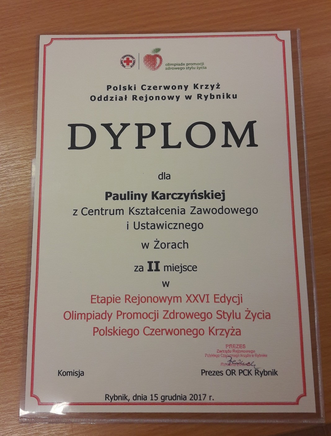 W dniu 15 grudnia 2017 r. w Rybniku odbył się Rejonowy Etap Olimpiady Promocji Zdrowego Stylu Życia PCK. Brała w nim udział uczennica naszej szkoły Paulina Karczyńska, która zajęła wysokie II miejsce. Do olimpiady uczennicę przygotowały panie: Agnieszka Szwamberg oraz Dorota Timler. W zorganizowaniu wydarzenia sportowego - który był warunkiem uczestnictwa w etapie rejonowym pomagał pan Bartłomiej Wyrozumski. Wszystkim serdecznie dziękujemy, a uczennicy gratulujemy sukcesu.