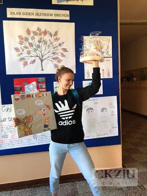 Konkurs na najlepszą pracę promującą naukę języków obcych wygrała Oliwia Pałka z klasy 2aT. (Dziękujemy p. Jolancie Cebuli za przygotowanie słodkiej nagrody). Natomiast pieniądze zebrane ze sprzedaży babeczek w kwocie 101 zł, zostały przeznaczone na karmę dla psów ze schroniska dla zwierząt w Żorach. Dziękujemy Sandrze Kozak z 4aT za zakup karmy i przekazanie jej do schroniska.