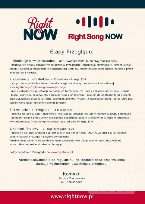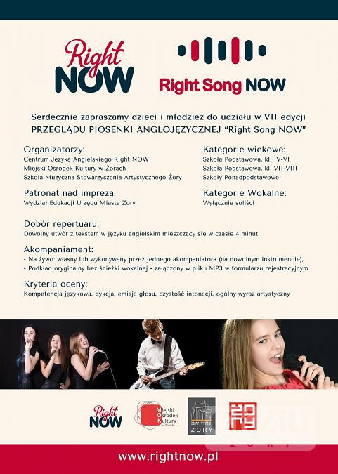 Zapraszam uczniów naszej szkoły do udziału w siódmej edycji PRZEGLĄDU PIOSENKI ANGLOJĘZYCZNEJ RIGHT SONG NOW organizowanej przez Centrum Języka Angielskiego oraz Stowarzyszenie Artystyczne Żory przy współpracy z Wydziałem Edukacji Urzędu Miasta Żory i Miejskim Ośrodkiem Kultury w Żorach. Eliminacje wewnątrzszkolne odbędą się do 17 kwietnia 2019 roku. Wyłonionych zostanie maksymalnie 5 najlepszych uczniów, którzy będą przesłuchani zarówno przez anglistę jak i muzyka. Każdy uczestnik śpiewa jeden dowolny utwór w języku angielskim, trwający nie więcej niż 4 minuty z podkładem muzycznym bez ścieżki wokalnej lub z jednym akompaniatorem na dowolnym instrumencie.