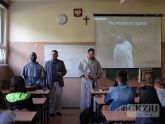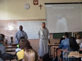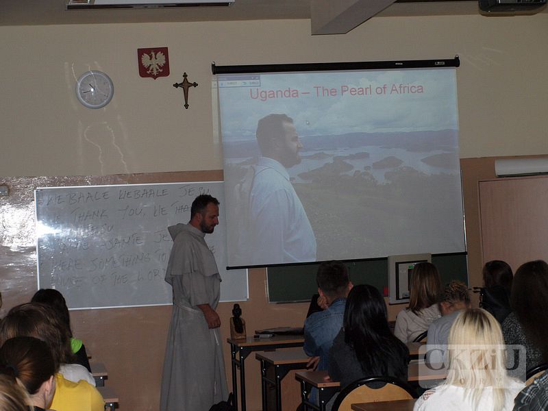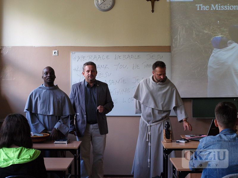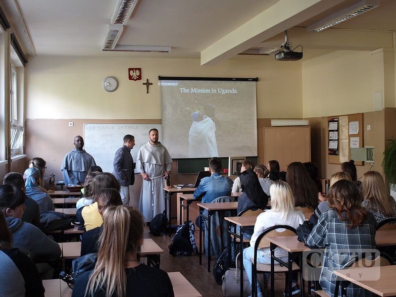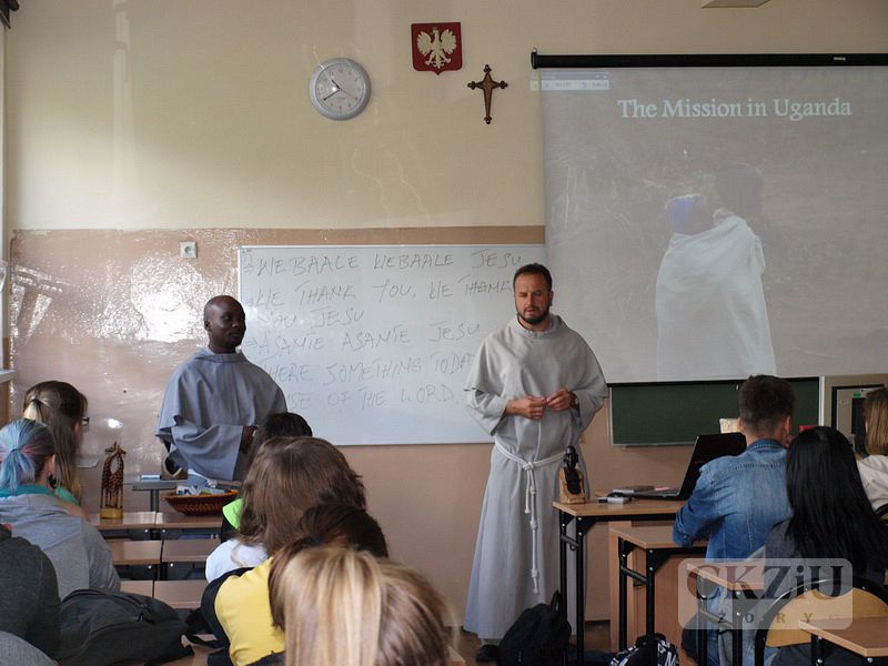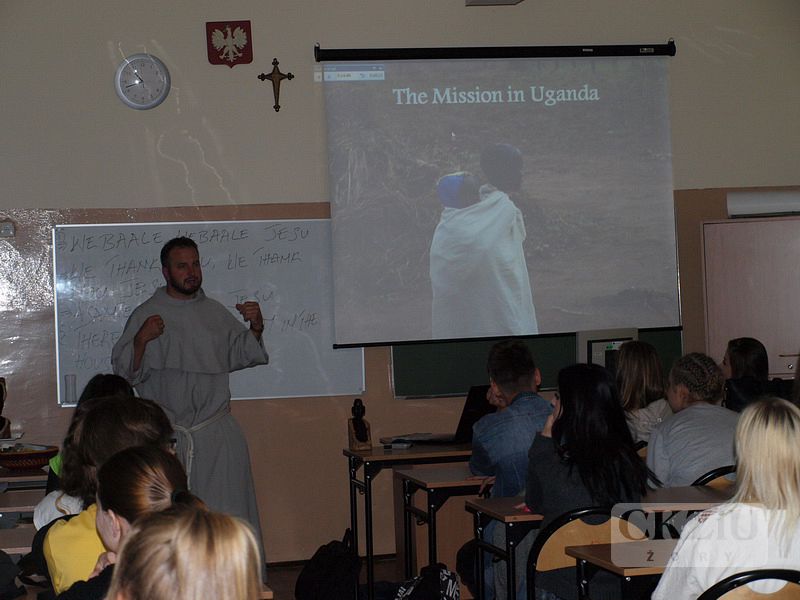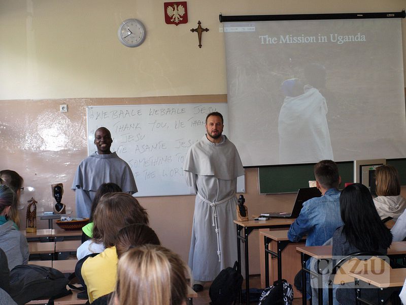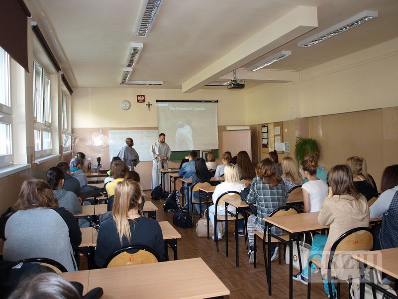 W dniu 21 września 2015r. na trzech jednostkach lekcyjnych odbyły się spotkania poszczególnych klas z misjonarzami: ojcem Adamem Klagiem oraz bratem Stevenem z Ugandy. Zakonnicy w czasie spotkania opowiadali o misjach franciszkańskich w Afryce, które polegają przede wszystkim na głoszeniu Ewangelii i odpowiadaniu na codzienne potrzeby, zwłaszcza ludzi najbiedniejszych. Przedstawiono również jak wygląda praca z dziećmi i młodzieżą misyjną przy parafiach i szkołach. Uczniowie poprzez oglądanie prezentacji, aktywnie uczestniczyli w zajęciach prowadząc dyskusję na tematy związane z kulturą i życiem tamtejszej ludności. Młodzież uczestnicząca w spotkaniu była bardzo zadowolona próbując włączyć się we wspólny śpiew afrykański oraz otrzymała od misjonarzy zakładkę misyjną.