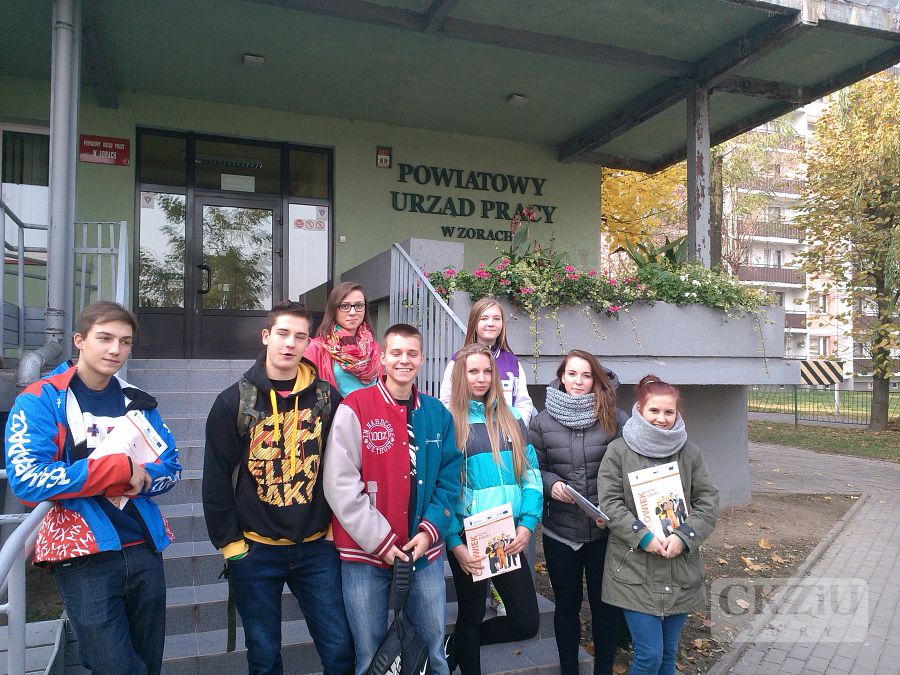 W ramach Ogólnopolskiego Tygodnia Kariery, uczniowie z klasy 2aZ spotkali się z panią Adelajdą Piekarczyk - kierownikiem poradnictwa zawodowego Powiatowego Urzędu Pracy w Żorach. Najpierw uczniowie wysłuchali krótkiego wykładu na temat zadań, jakie podejmuje Urząd Pracy wobec pracodawców i przedsiębiorców oraz bezrobotnych i poszukujących zatrudnienia. Następnie uczniowie poszukiwali odpowiedzi na zadane im pytania, pukając do odpowiednich drzwi urzędu i rozmawiając z poszczególnymi pracownikami. Dzięki tym ciekawym zajęciom uczniowie zdobyli wiedzę na temat instrumentów rynku pracy, takich jak staże zawodowe, granty na utworzenie stanowiska pracy, środki na rozpoczęcie własnej działalności, oferta szkoleń, czy poradnictwo i informacja zawodowa. Była to także okazja żeby rozwinąć swoje kompetencje społeczne. Uczniowie nie tylko musieli porozmawiać z pracownikami urzędu, ale później podzielić się zdobytą wiedzą ze wszystkimi uczestnikami zajęć. Uczniowie otrzymali pomoce w postaci teczki z materiałami i gadżety. Lekcja odbyła się w ramach stałej współpracy na linii CKZiU - PUP, a za jej przygotowanie i przeprowadzenie dziękujemy serdecznie paniom Irenie Ficek, Adelajdzie Piekarczyk i pozostałym pracownikom Powiatowego Urzędu Pracy w Żorach.