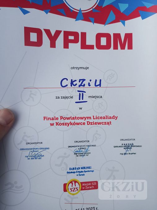 W 16.11.2023 na hali Zespołu Szkół nr 1 odbył się Finał Powiatowy Licealiady w Koszykówce Dziewcząt. Nasz zespół zdobył v-ce Mistrzostwo Żor ulegając jedynie z finale po emocjonującym spotkaniu zespołowi z Zespołu Szkół nr 2. Zespół wystąpił w składzie: Sandra Brzegowy, Jessica Brzegowy, Wiktoria Zawierucha, Maja Warakomska, Alicja Łyduch, Patrycja Juraszek, Natalia Major, Klaudia Stankiewicz oraz Daria Woźniak. Trener zespołu: Grzegorz Marciak .