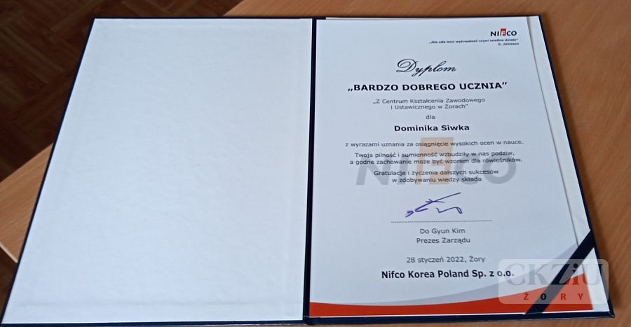 Kolejny raz firma Nifco Korea Poland ufundowała stypendia naszym uczniom. Ceremonia rozdania stypendiów dla uczniów Branżowej Szkoły I Stopnia wyróżniających się w nauce odbyła się 1.02.2022 r. w szkole, z udziałem dyrektora szkoły – pani Beaty Kuźnik i kierownika praktycznej nauki zawodu – pani Bożeny Długosz. Koreańska firma specjalizuje się w produkcji elementów wyposażenia samochodów marki KIA i Hyundai.