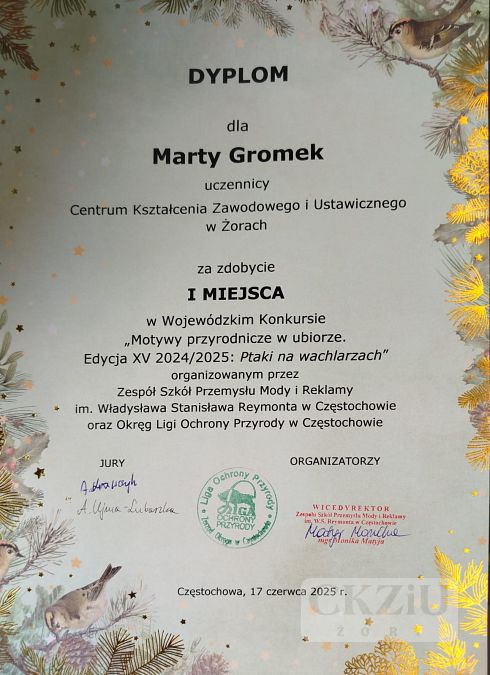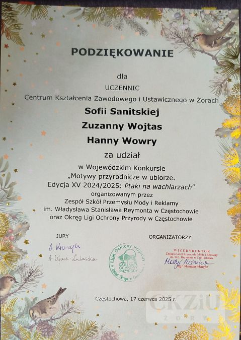 W dniu 17.06.2025r mieliśmy ogromną przyjemność uczestniczyć w uroczystym rozdaniu nagród w Wojewódzkim Konkursie “Motywy przyrodnicze w ubiorze. Edycja XV 2024/2025: Ptaki na wachlarzach." organizowanym przez Zespół Szkół Przemysłu Mody i Reklamy im Władysława Stanisława Reymonta w Częstochowie oraz Okręg Ligi Ochrony Przyrody w Częstochowie.
