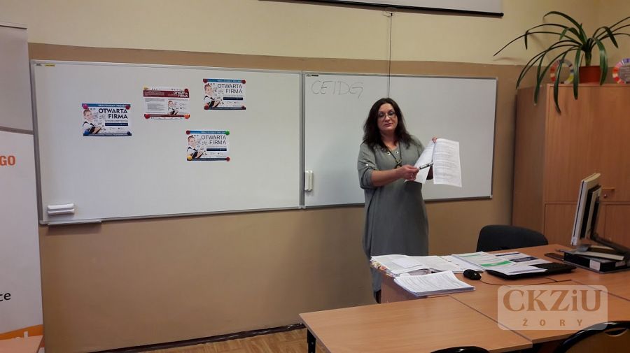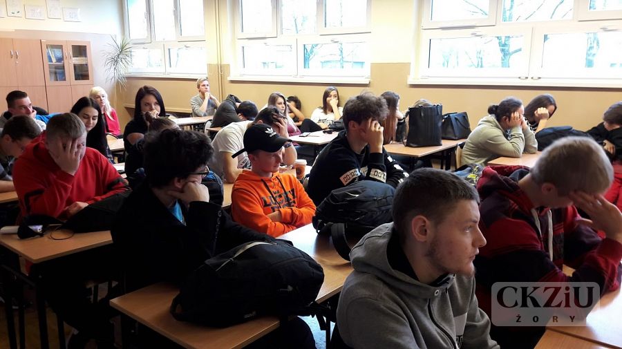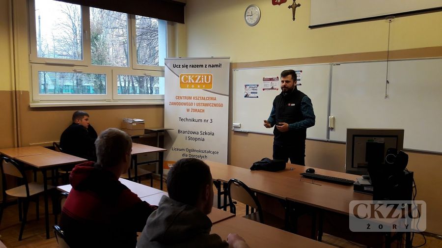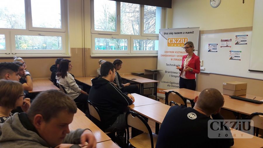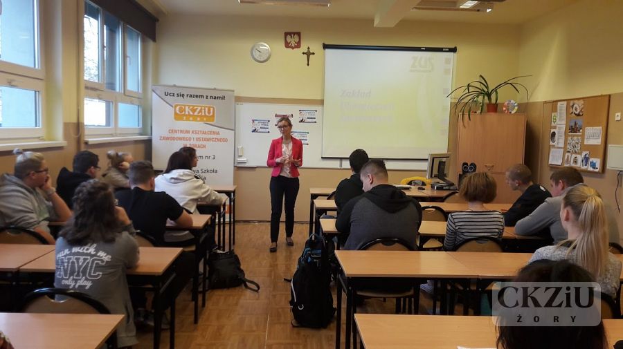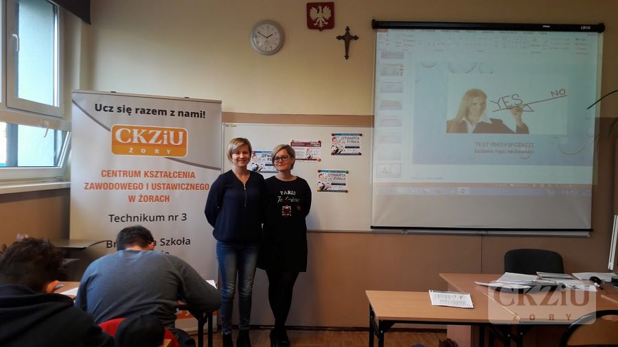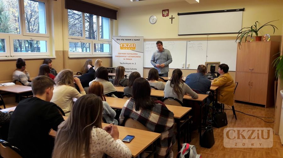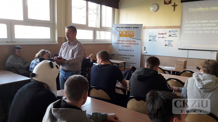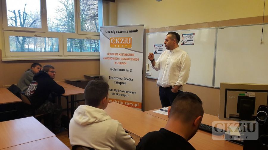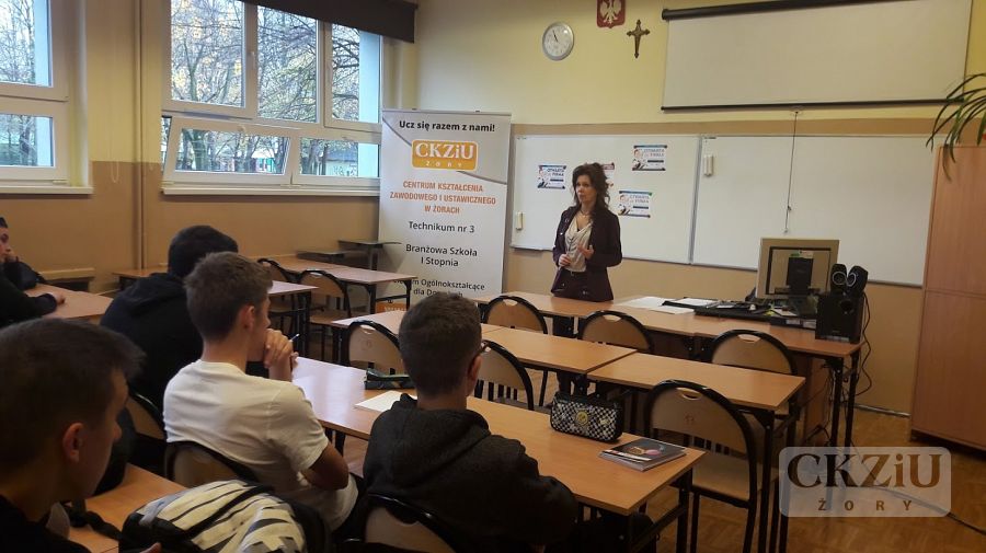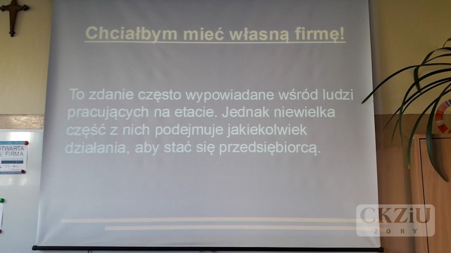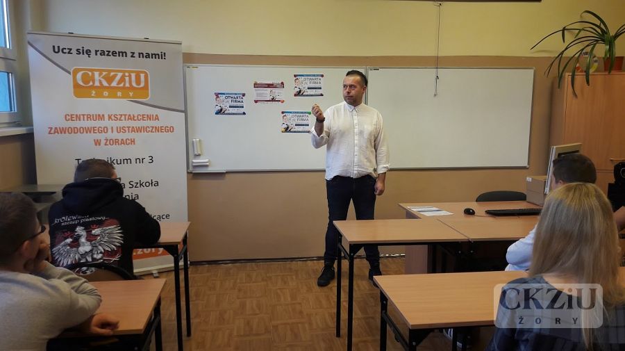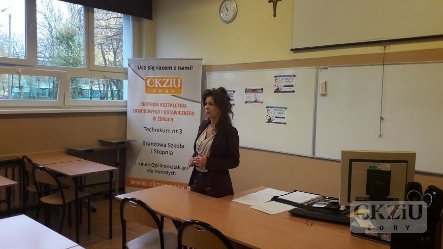 W ramach Światowego Tygodnia Przedsiębiorczości szkoła zaprasza wolontariuszy tj. przedsiębiorców oraz przedstawicieli instytucji związanych z prowadzeniem działalności gospodarczej, celem przeprowadzenia lekcji „Biznes przy tablicy”. W naszej szkole odbyło się wiele zajęć, mających na celu uatrakcyjnienie lekcji podstaw przedsiębiorczości, przedmiotów zawodowych ekonomicznych oraz zajęć z wychowawcą. Uczniowie wzięli udział w licznych ciekawych spotkaniach prowadzonych m.in. przez panią Elwirę Wiechniak z Punktu Pośrednictwa Pracy w Żorach, pana Adama Rojka przedsiębiorcę z Żor prowadzącego firmę Roys Auto Szkoła, panią Anetę Dolińską z Powiatowego Urzędu Pracy w Żorach, pana Piotra Palę byłego przedsiębiorcę branży samochodowej, panią Beatę Kopczyńską z Zakładu Ubezpieczeń Społecznych w Rybniku, pana Macieja Wójciaka przedsiębiorcę z Jastrzębia-Zdroju przedstawiciela firmy Hantesis, panią Dorotę Kaczmarczyk z Urzędu Skarbowego w Żorach oraz pana Łukasza Gamonia dyrektora ds. sprzedaży internetowej firmy Permetal z Żor.