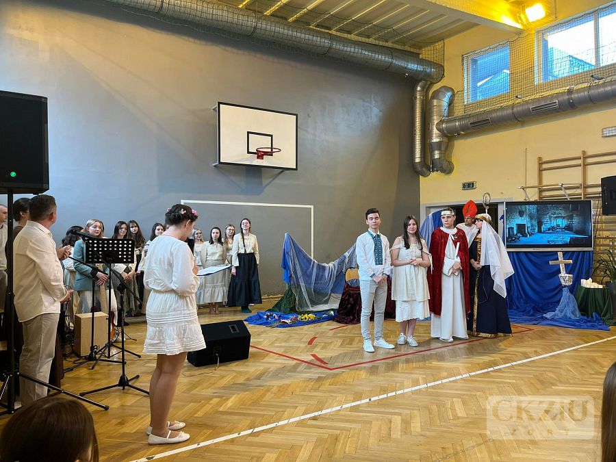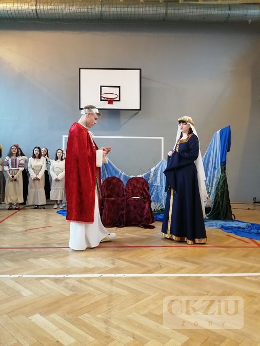 14 kwietnia obchodziliśmy 1057 rocznicę Chrztu Polski. Z tej okazji w naszej szkole odbyła się wyjątkowa lekcja historii. Przenieśliśmy się w czasie do 966 roku i spotkaliśmy się z Mieszkiem I i Dobrawą. Uczniowie dokonali rekonstukcji historycznej i przedstawili, jak mogło wyglądać pierwsze spotkanie polskiego księcia z czeską księżniczką oraz sam chrzest. Całości towarzyszył komenatrz historyczny opowiadany przez narratora i piękne słowiańskie rytmy w wykonaniu naszego szkolnego chórku. Bardzo dziękujemy wszystkim zaangażowanym:
