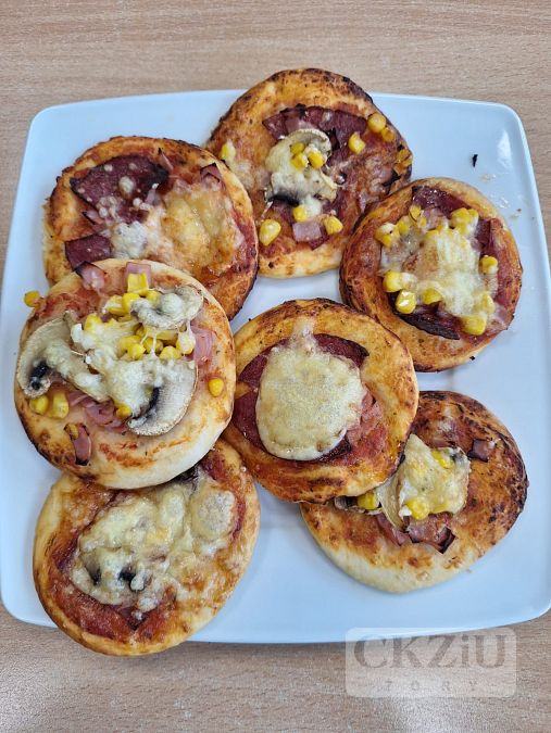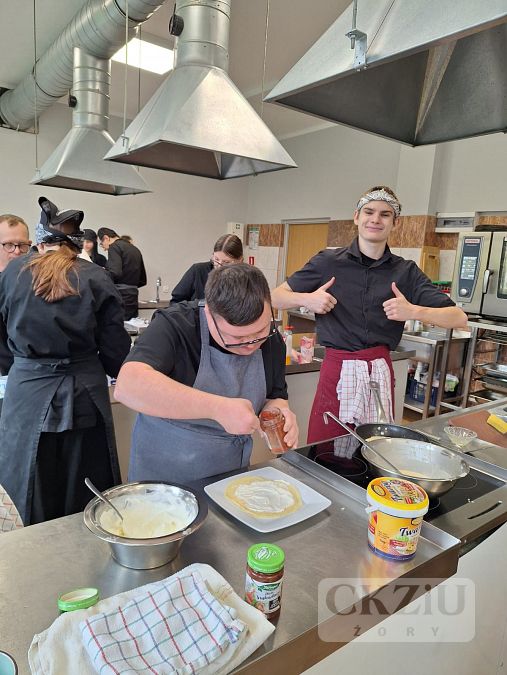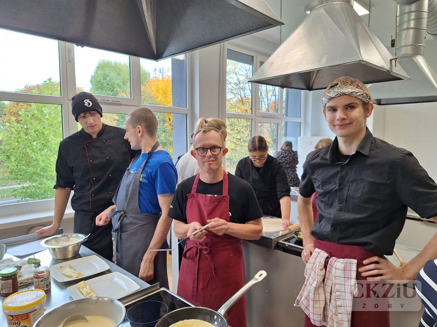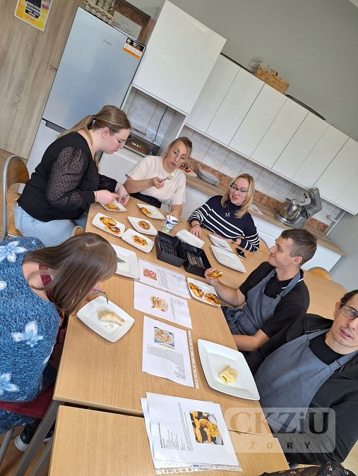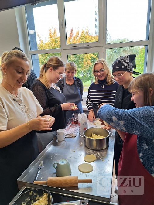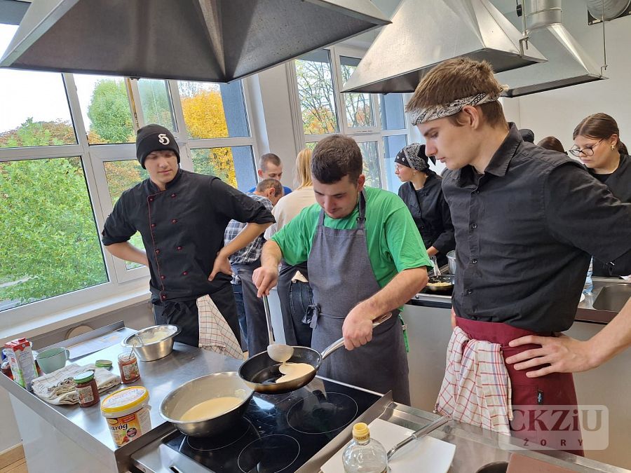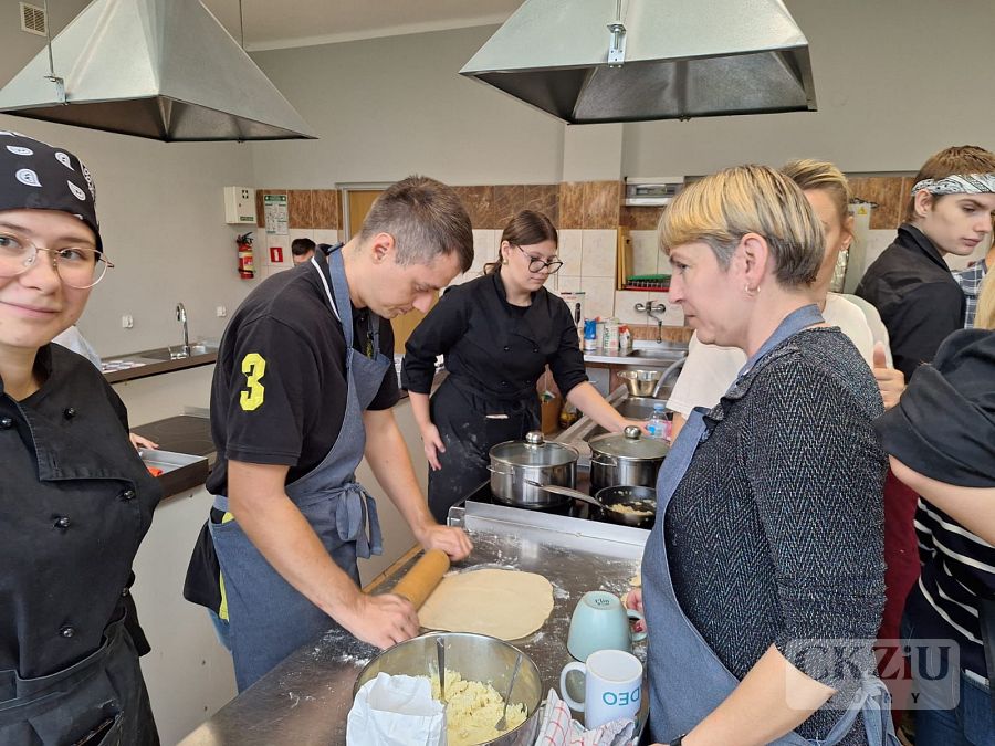 Warsztaty gastronomiczne odbyły się z udziałem klas 2T i 3bT, pod kierunkiem pani Agnieszki Szwamberg, również uczestniczącej w job-shadowing, oraz uczniów ze stażu zagranicznego. Wspólnie przygotowywano gofry, muffinki, naleśniki z serem i dżemem, pizzerinki oraz tradycyjne pierogi ruskie.