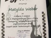 Dnia 16.10.2024 odbył się w rybnickim Zespole Szkół Technicznych, który propaguje rozwijanie u młodych ludzi przeróżnych zainteresowań i pasji. Uczestnicy prezentowali swoje uzdolnienia muzyczne, wokalne, plastyczne, naukowe i rękodzielnicze. Naszą szkołę reprezentowała, już po raz drugi, Matylda Weber z klasy 5bT. Uczennica zaprezentowała jury i publiczności swoje niezwykłe prace z dziedziny witrażu. Jury doceniło piękną prezentację, wkład pracy i dekoracyjność dzieł Matyldy II miejscem w kategorii artystycznej.