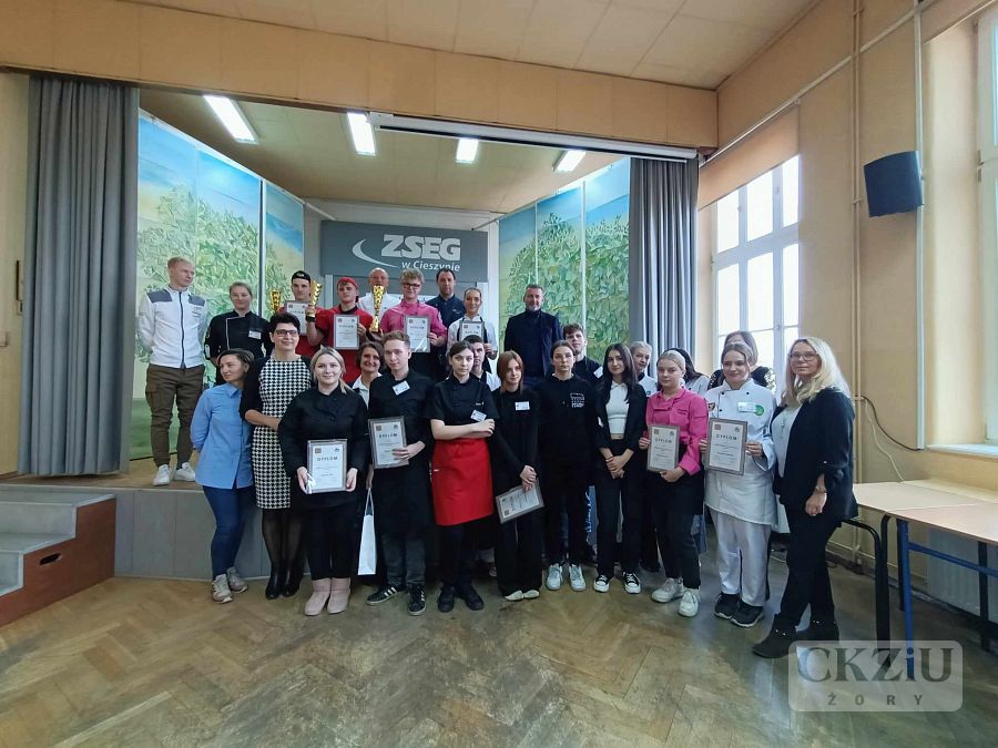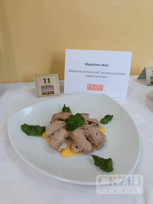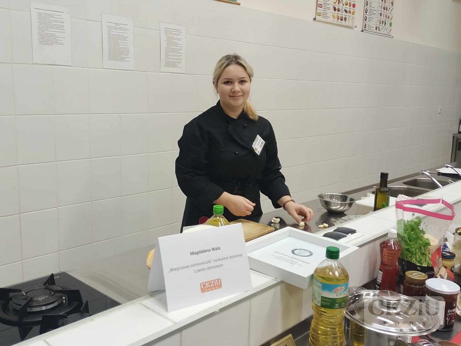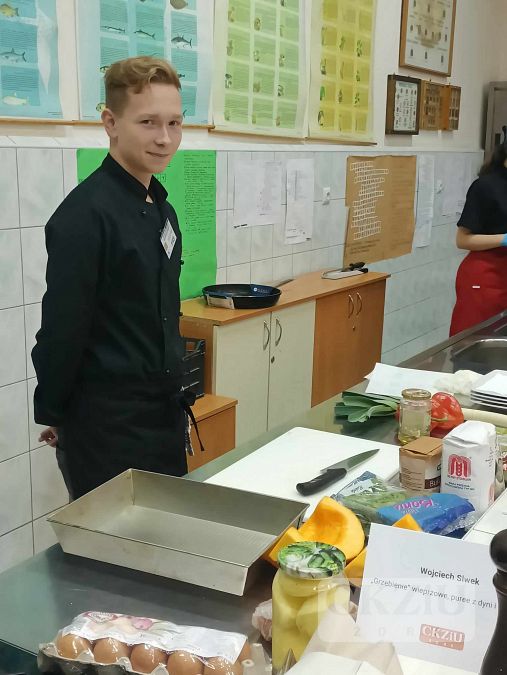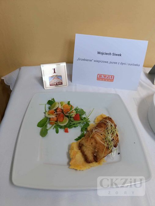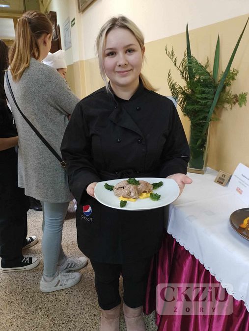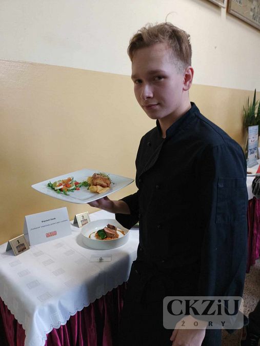 Dnia 23.11.2023r. nasi uczniowie: Magdalena Wala i Wojciech Siwek z kl.3b pod opieką pani Moniki Hołowni oraz pana Adama Rojka wzięli udział w XI Beskidzkim Konkursie Młodych Kucharzy, który odbył się w Zespole Szkół Ekonomiczno – Gastronomicznych w Cieszynie. Poziom konkursu był bardzo wysoki, a nasi uczniowie wykazali się dużym profesjonalizmem i umiejętnościami gastronomicznymi. Magda wykonała „Wieprzowe ośmiorniczki” na kostce dyniowej z pesto dyniowym, z kolei Wojtek „Grzebienie” wieprzowe, puree z dyni i surówkę. Choć nie udało się zdobyć miejsca na podium, było to dla nich duże doświadczenie praktyczne i lekcja radzenia sobie w warunkach stresu i presji czasowej.
