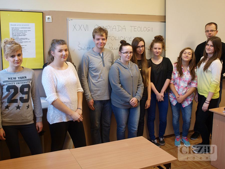 W dniu 17 listopada 2015r. w naszym Centrum odbył się etap szkolny XXVI Olimpiady Teologii Katolickiej, przebiegającej pod hasłem "Święty Jan Paweł II - wychowawcą młodych pokoleń". Test zawierał 33 pytania i nie należał do łatwych. Do rywalizacji przystąpiło 13 uczniów. Najliczniej reprezentowane były klasy 2bT, 3T i 3cZ. Po jednym przedstawicielu miały klasy 2cZ, 3bZ, 3eZ i 4bT. Po komisyjnym sprawdzeniu prac okazało się, że najlepszy wynik w naszej szkole uzyskała Julia Stabla z klasy 3T i to właśnie Julia będzie w styczniu reprezentować CKZiU w Żorach na etapie diecezjalnym OTK w Katowicach. Warto zaznaczyć, że Julia już po raz drugi wygrywa w etapie szkolnym OTK. Tuż za Julią uplasował się Tomasz Krupa z klasy 3cZ. Najlepsi uczniowie na lekcjach religii otrzymają pamiątkowe nagrody. Wszystkim serdecznie gratulujemy. Julii życzymy wytrwałości w przygotowaniach do kolejnego etapu.