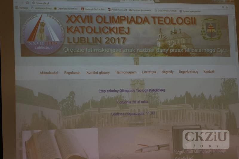 W dniu 7 grudnia 2016 r. w naszym Centrum odbył się etap szkolny XXVII Olimpiady Teologii Katolickiej, przebiegającej pod hasłem: „Orędzie fatimskie jako znak nadziei dany przez Miłosiernego Ojca”. Zawody I stopnia polegały na rozwiązaniu w ciągu 45 minut testu pisemnego (jednokrotnego i wielokrotnego wyboru) oraz odpowiedzi na otwarte pytania określające stopień przyswojenia wiadomości na podstawie wskazanych lektur. Do rywalizacji przystąpiło 7 uczniów z następujących klas: 2bZ, 1aT, 3aT, 3bT i 4T. Najlepsze wyniki uzyskały uczennice: Julia Stabla z 4T oraz Dominika Habor z 3aT, które w styczniu 2017 r. będą reprezentowały naszą szkołę na etapie diecezjalnym OTK w Katowicach. Warto podkreślić, że Julia już po raz trzeci uzyskała najwyższy wynik w zawodach I stopnia. Uczestnicy Olimpiady prezentowali wysoki poziom wiedzy religijnej odpowiednio interpretując treść chrześcijańskiego orędzia i naukę Kościoła Katolickiego. Wszystkim uczniom Olimpiady serdecznie gratulujemy i dziękujemy za szlachetne współzawodnictwo. Julii i Dominice życzymy wytrwałości w przygotowaniach do kolejnego etapu oraz dalszych sukcesów.