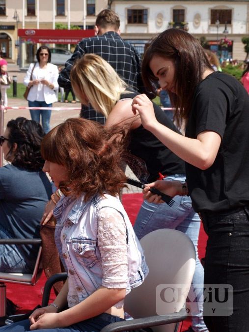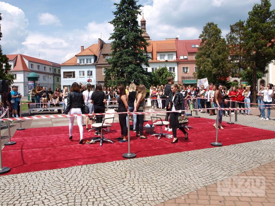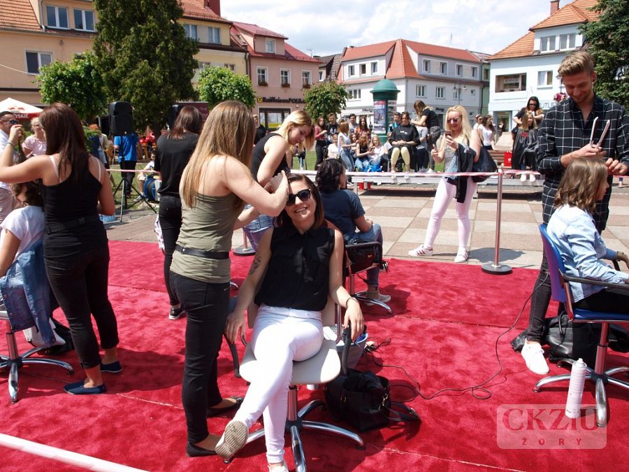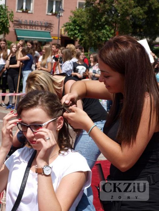 W dniu 13 czerwca 2016 r. na żorskim rynku odbył się finał ogólnomiejskiej akcji „Zmień los - oddaj włos”. Przedsięwzięcie organizowane było przy współpracy z Fundacją Rak’n’Roll i miało na celu zbiórkę włosów, które przeznaczone zostały na peruki dla kobiet w trakcie chemioterapii. Impreza rozpoczęła się o godz. 12:00 na żorskim rynku flash mobem wykonanym przez uczniów z: Gimnazjum nr 2, Zespołu Szkół Ogólnokształcących, Zespołu Szkół nr 2 oraz oczywiście przez naszych uczniów z klasy 1cZ i 3eZ. Organizatorzy przygotowali wiele atrakcji, jedną z nich było publiczne obcinanie włosów. O fachowe ich skrócenie zadbali styliści z żorskich salonów: Studio Urody Bellissima, Studio Fryzjerskie „Shine” oraz Pracowni Fryzur - Małgorzata Szafarczyk. Podczas happeningu odbył się pokaz fryzur, wykonany przez naszych uczniów. Były to krótkie cięcia w różnych wariacjach. Na czerwonym dywanie modelki zaprezentowały m.in. nowoczesne 'looki' do pracy, szkoły, a także na wieczorowe wyjście z przyjaciółmi. W tym samym czasie, na rozstawionych tuż obok Powerbike’ach było można sprawdzić swoją kondycję fizyczną, której celem była promocja zdrowego trybu życia. Druga część imprezy przeniosła się do kina „Na Starówce”, gdzie odczytane zostały trzy listy do raka napisane przez żorską młodzież oraz wyświetlone kilkuminutowe spoty relacjonujące działania związane z akcją, które organizowano w szkołach. W galerii „Na Starówce” można było obejrzeć specjalną wystawę dedykowaną tej szczytnej inicjatywie. Na zakończenie odbyła się projekcja filmu „Gwiazd naszych wina” (reż. Josh Boone). Wszystkim uczniom z naszej szkoły serdecznie dziękujemy za duże zaangażowanie w czasie tej akcji. Na szczególne podziękowania zasłużyli uczniowie, którzy przygotowali pokaz fryzur krótkich: Aleksandra Jarczok 1cZ, Sandra Kumor 2cZ, Sylwia Pękala 2cZ, Hubert Micor 2cZ oraz Sandra Kremiec 3eZ i ich modelki Nicola Laskowska 1cZ, Małgorzata Marszołek 2cZ, Oliwia Jaklewicz 2Cz, Joanna Wojtas 2cZ oraz Daria Gołębiewskia z ZS nr 6 w Jastrzębiu Zdroju. Serdeczne podziękowania także dla pana Macieja Wójciaka z firmy Koloryzacje.com, który objął patronat nad uczniami w czasie pokazu.Koordynatorem przedsięwzięcia była pani Aneta Mrowiec.